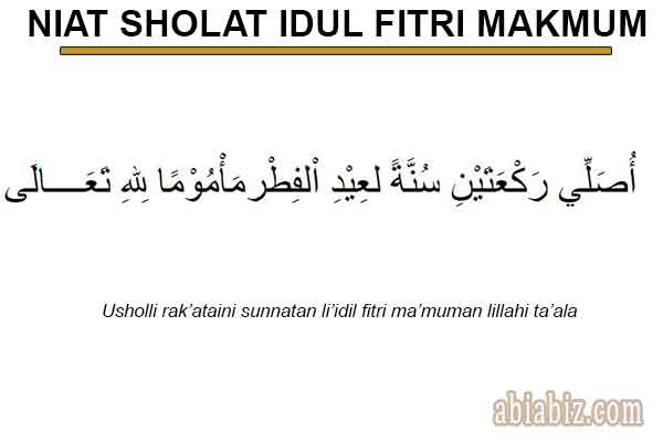 “Aku berniat shalat sunnah idul fitri dua rakaat menjadi makmum karena Allah ta’ala.”